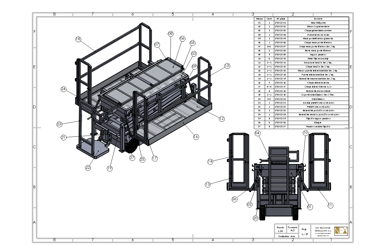 El proyecto de la máquina GAM ORION consiste en el diseño y la fabricación de una plataforma elevadora móvil de personal (P.E.M.P.) destinada al transporte y elevación de féretros. Dentro del mismo proyecto se ha realizado el diseño CAD completo de la plataforma elevadora, incluyendo todos los elementos que la componen: estructura, sistemas de elevación, componentes mecánicos y de seguridad. El diseño ha sido acompañado por sus correspondientes cálculos de resistencia, estabilidad y capacidad de carga, asegurando el cumplimiento de los requisitos técnicos y normativos.