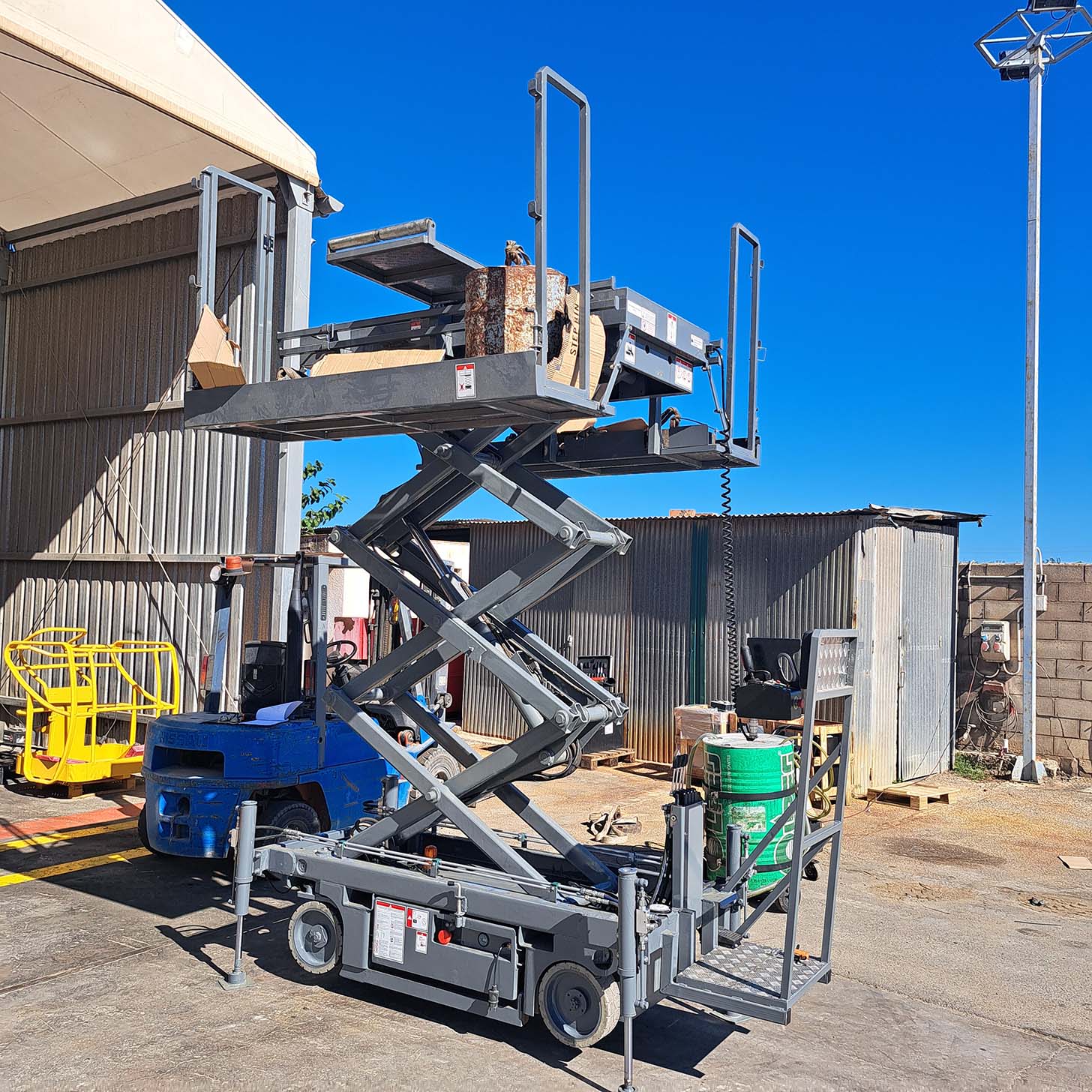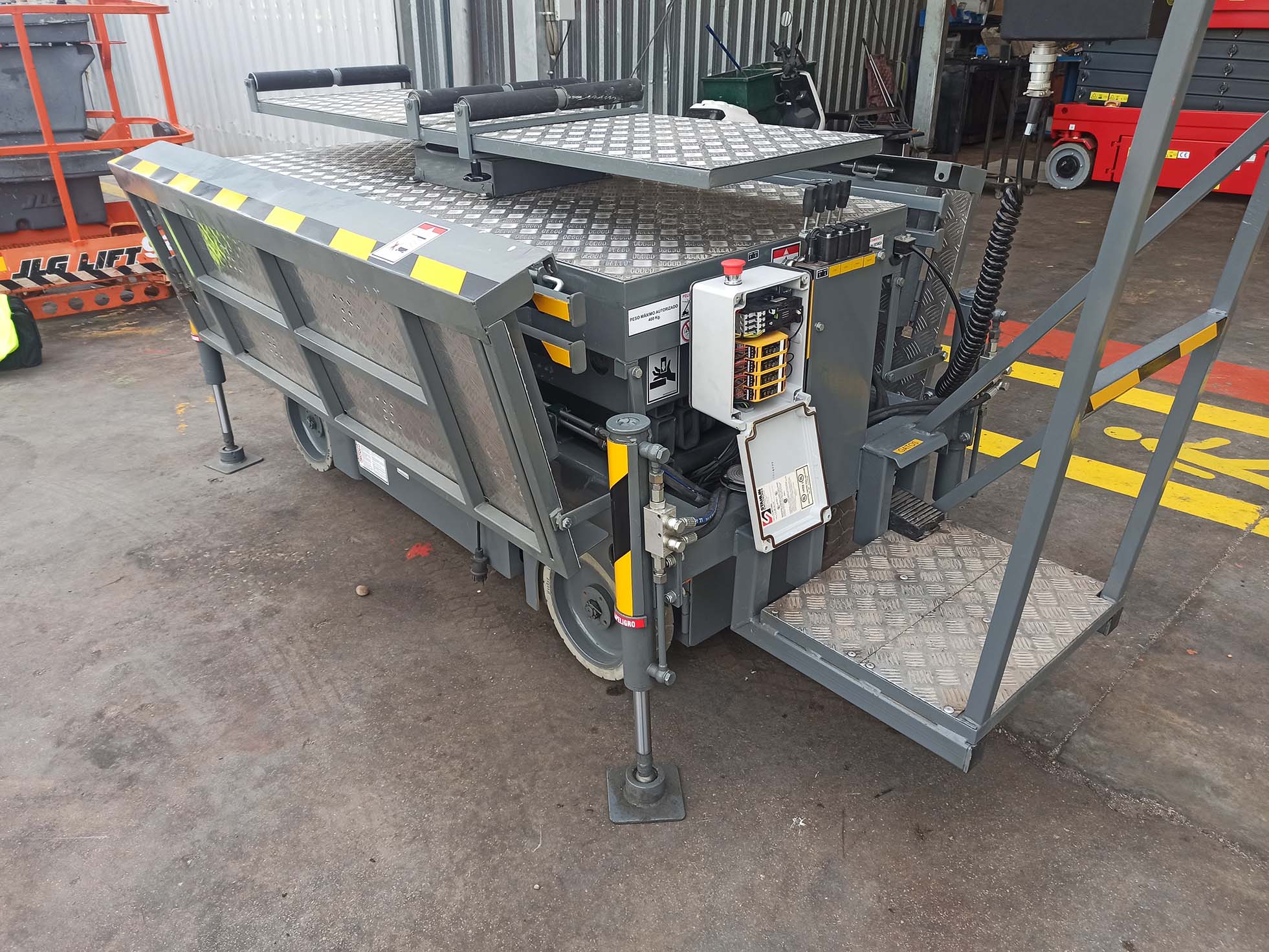 Además, se ha realizado una modificación consistente en la sustitución de estabilizadores manuales por estabilizadores hidráulicos, con el fin de mejorar la estabilidad y seguridad de la máquina, cumpliendo con la normativa UNE EN 280:2023, que regula cálculos de diseño, estabilidad, construcción y seguridad en este tipo de plataformas.